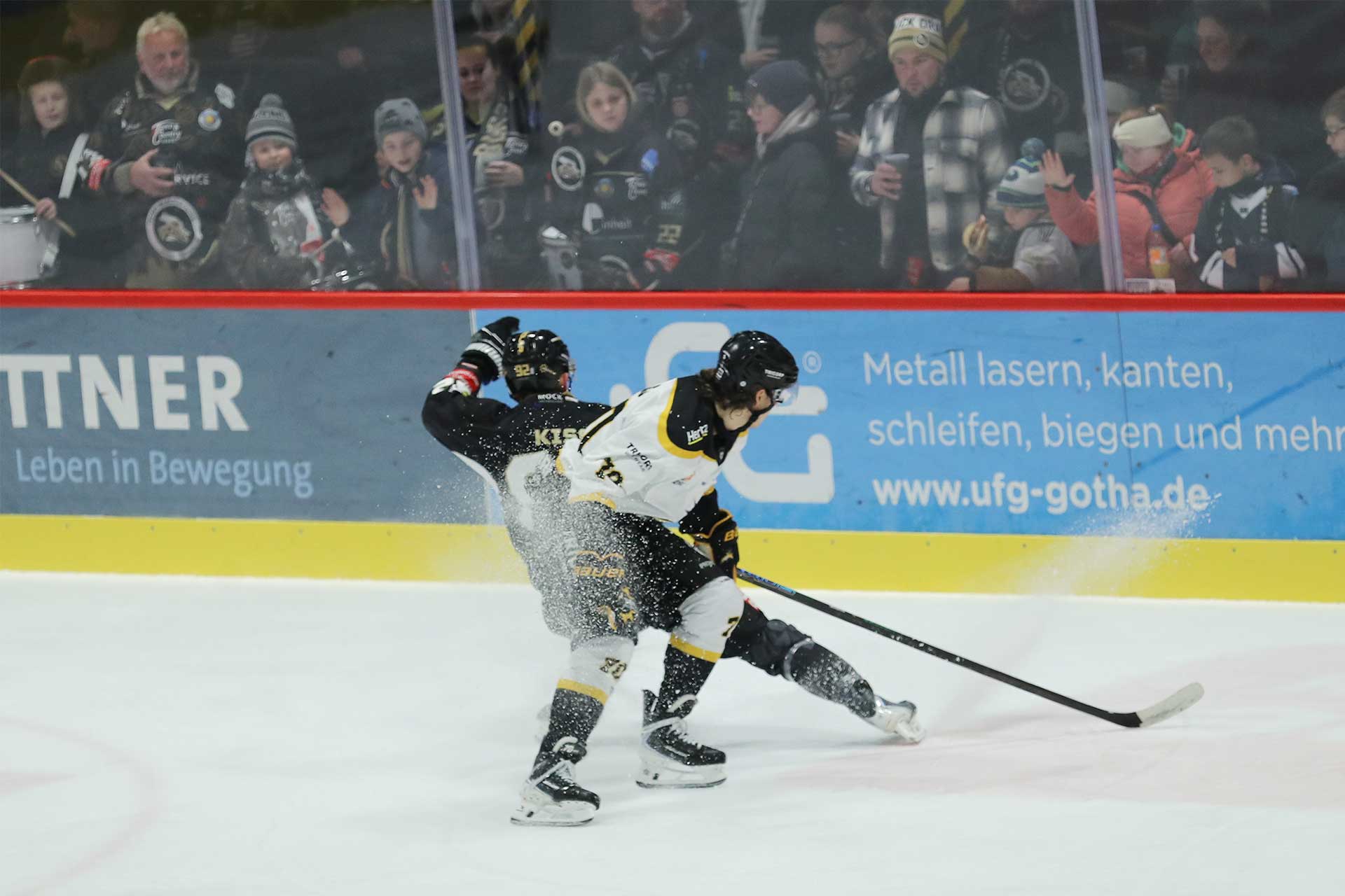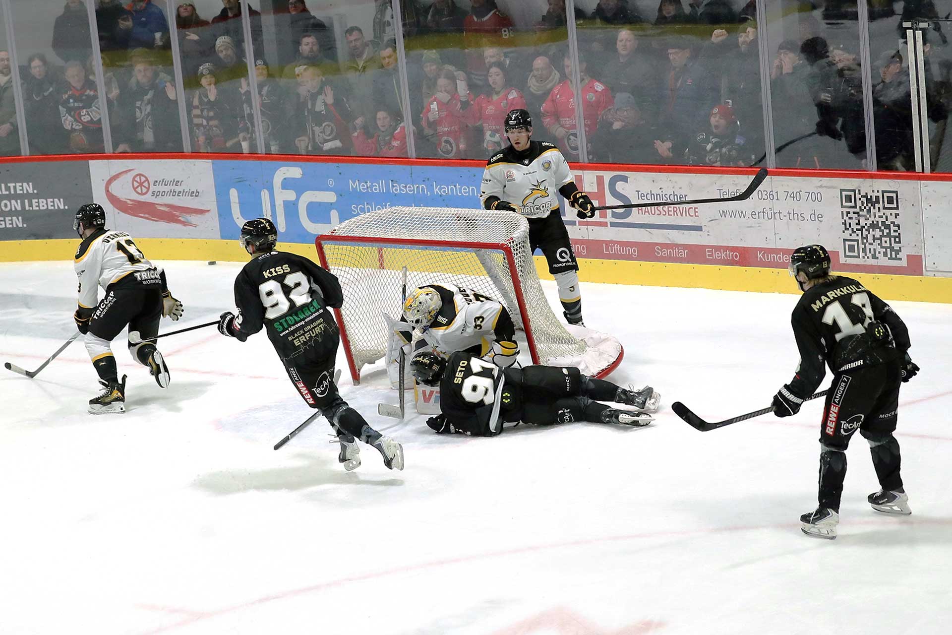Das dritte Drittel begann, angetrieben von den unermüdlich anfeuernden Fans, die ein Gespür dafür hatten, dass die Mannschaft sie jetzt braucht, mit etlichen vielversprechenden Angriffen der TecArt Black Dragons. In der 44. Spielminute führte dann ein solcher Angriff zum erhofften Torerfolg. Einen von der Bande abprallenden Schuss von Miro Markkula landetet bei Santeri Haarala, der im Fallen mit einem Bauerntrick zum 1:2 aus Sicht der TecArt Black Dragons den Anschlusstreffer erzielte. Die Tilburg Trappers, musste nun alles aufbieten, um gegen die Erfurter Standhaftigkeit zu bestehen. Der Traum den Tilburg Trappers ein Bein stellen zu können lebte. Mit den tollen Fans im Rücken rollte nun Angriff auf Angriff auf das Tor der Tilburg Trappers. Doch leider hatte auch der Torhüter der Tilburg Trappers einen guten Tag erwischt und konnte seinen Kasten sauber halten. In der 58. Spielminute schien sich das Glück doch noch den TecArt Black Dragons zuzuwenden. Ein Spieler der Tilburg Trappers, musste wegen zu vielen Spielern auf dem Eis auf die Strafbank, und der Coach der Tec Art Black Dragons nahm sofort eine Auszeit, um seine Mannschaft für die letzten beiden Minuten des Spiels neu einzustellen. Ohne Torhüter, aber mit sechs Feldspielern auf dem Eis versuchten die Erfurter, den Ausgleich zu erzielen. Mit Glück und Geschick verteidigten die Gäste aber ihren Vorsprung trotz doppelter Unterzahl (vier gegen sechs Feldspieler) in den beiden Schlussminuten.