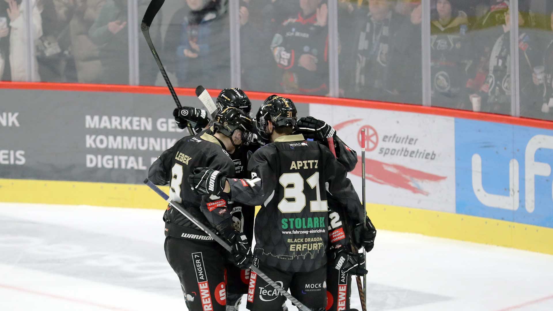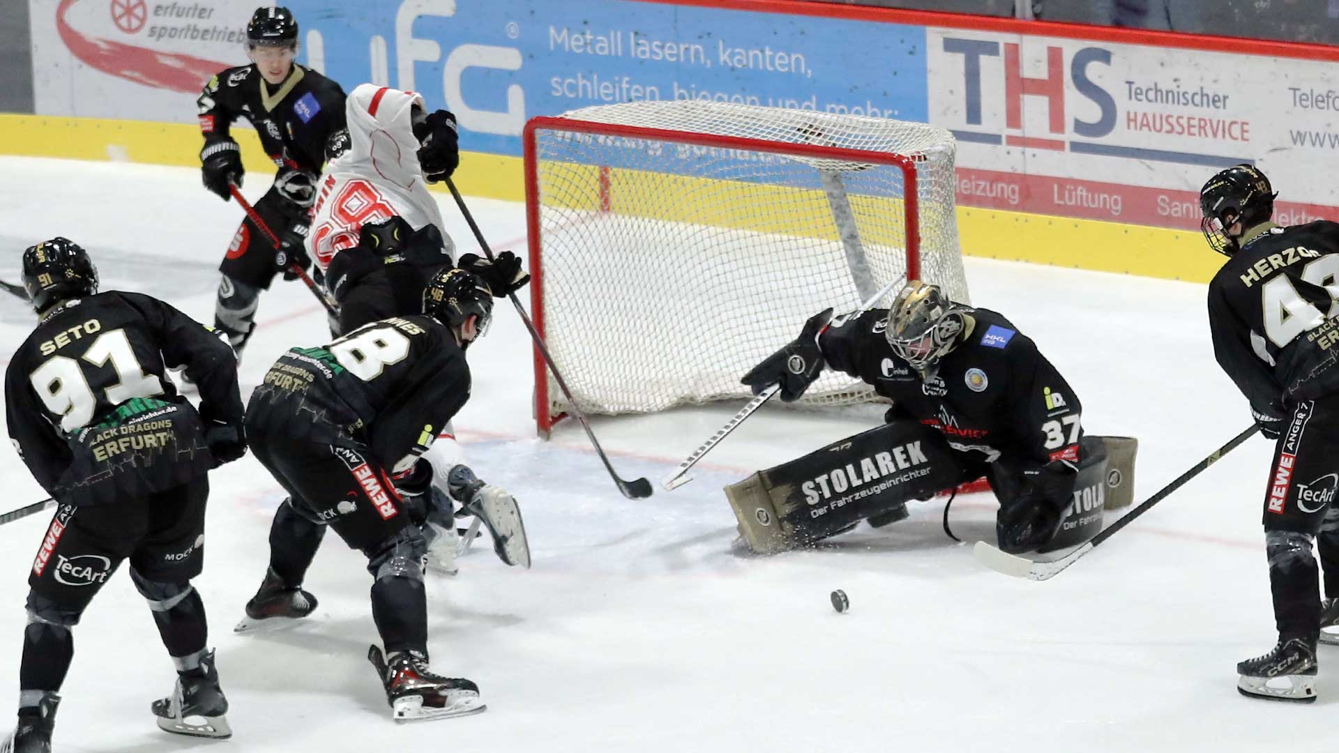 Es waren gerade mal 51 Sekunden gespielt, da musste gleich der erste Fuchs auf die Strafbank. Erfurt, für sein effizientes Überzahlspiel zuletzt hochgelobt, ließ diese Gelegenheit - wie die vier weiteren - jedoch ungenutzt verstreichen. Dann wurde aufs Gästetor geballert. Jonas Gerstung, Maurice Keil, Miro Markkula, Niklas Jakob, Santeri Haarala - alle durften mal. Ergebnis: Null. Viel Aufwand, wenig Nutzen. Keine Hundertprozenter. 10. Minute: Strafe Drachen. Patrick Glatzel im 1,83 mal 1,22 Meter großen Tor der Erfurter bekommt Arbeit. Reichlich Arbeit. Danach im Gegenzug: Haarala, Markkula - immer wieder. Aber es fehlt den Hausherren an Präzision. Bis zur 19. Spielminute. Da knackt das Duo Fritz Denner und Maurice Keil den Fuchsbau. Links durch, Rückpass in die Mitte - Tor. Tolle Kooperation.