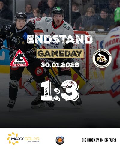 Erfurt macht von der ersten Minute Druck und kann sich gut im Verteidigungsdrittel der Piranhas festsetzten. In der achten Spielminute hatte #14 Louis Postel die beste Chance, die Drachen in Führung zu bringen. Doch der Rostocker Goali #30 Sebastian Albrecht vereitelt das Tor. Aber auch die Piranhas konnten sich nun häufiger durchsetzen und forderten #37 Patrik Glatzel. Vor allem in ihrem ersten Überzahlspiel an diesem Abend. Und auch im Anschluss daran bestimmten die Piranhas das Spiel, wenn auch nicht wirklich torgefährlich. Und so ging es 0:0 in die erste Drittelpause. Bis dahin, abgesehen von zwei-drei Situationen, ein eher unspektakuläres Spiel.